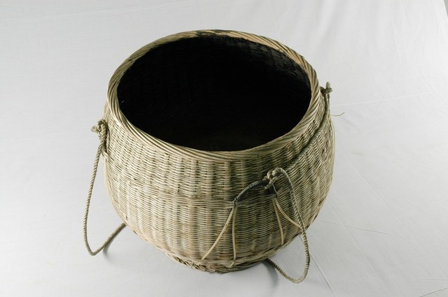 1.本物件為竹製品,為一開放式之圓形魚籠,編織方式為條紋交叉編織縛紮而成,四周為並以較粗之棉繩環繞,便於背上或攜帶。 2.魚簍為放置漁獲的器具,在捕魚或是釣魚時使用,籠頸處綁上細繩可繫在捕魚人的腰間隨身攜帶,籠口較小且高的設計也可防止漁獲跳出。