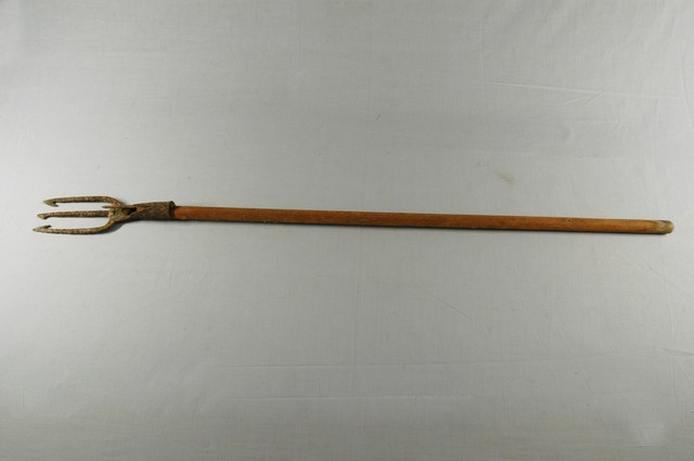 本文物為魚叉,用來捉魚的魚具。魚叉以三支有倒鉤的鐵製尖齒構成叉形,用來插住魚身。叉後端收成圓筒形箍以置木柄。箍與木柄間插入一叉齒為塞片,以固定叉頭與木柄。本件叉頭生鏽。根據典藏來源資料,本件文物收集來源地在臺東。