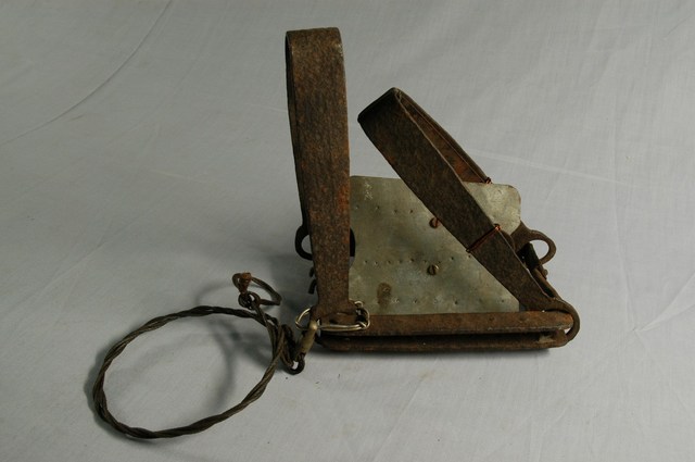 1.本物件為鐵陷機,是鐵製品,呈現為三角形樣貌,以3個鋼箍交互環繞而成,最下方有一鐵片為底,中間可以掛置誘餌,誘使動物進入陷阱,旁邊並有一鐵絲圈,便於攜帶或是獵捕到動物時提取。 2.用途:狩獵陷阱可能是第一種用於狩獵的工具,此類陷阱通常放置於動物的大約行走路徑,有時會另外放上一些餌誘以誘捕山羌、山豬、鹿或兔子等動物,傳統上,陷阱會緊緊關上鋼箍,確保動物不會逃脫。