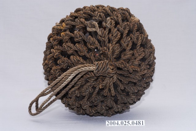 1.本物件為浮標,外層為麻繩以網狀編織方式結成一提袋,袋中放入空心玻璃球,底部以較粗編織使其不致掉落,上方則以結繩收口,方便提取。 2.用途:是50年代前討海人,從事捕撈作業時綁在漁網上的浮標,利用浮球會浮在水上的特性,將浮球沿著繩子垂釣,放在水上作為抓魚的記號。
