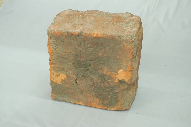 大角磚,用於傳統漢式建築的地基或壁體,或磚瓦窯的窯壁或窯門。本件磚長寬與尺磚、瓦相似,可能於磚瓦窯窯燒作為坯腳上的墊磚,上承磚瓦生坯。臺灣由清中葉開始本地即有磚瓦窯,此外,為建築廟宇或大宅,常於建築基地附近設置臨時的磚瓦窯燒製該次建築用磚,大角磚先作為燒窯用途,燒製完成後即用於建築地基或牆體。窯場建築及燒窯使用的大角磚,自清代至今皆維持不變。大角磚製作方法與土埆磚相同,因此具有一般土埆磚的外形特徵,即四個側面的切面與底面平整,頂面粗糙不平。