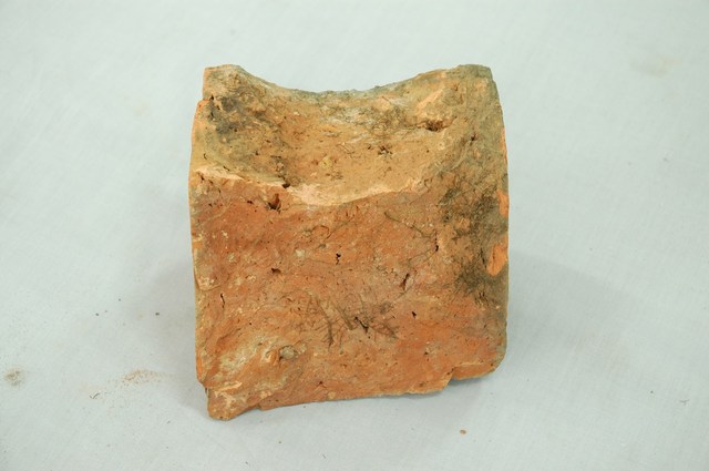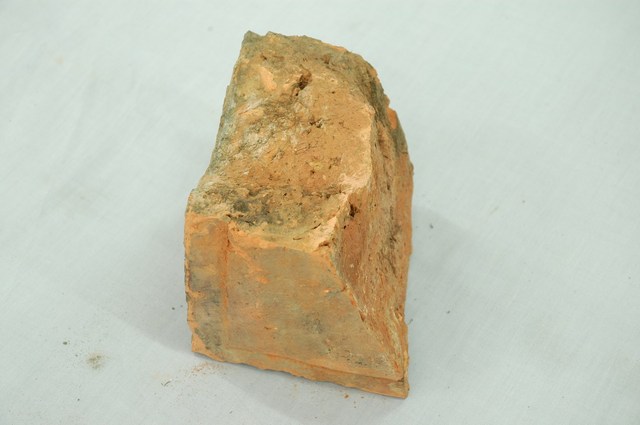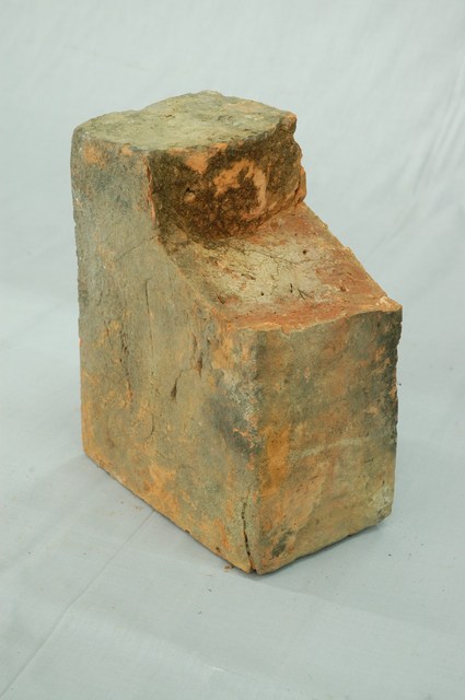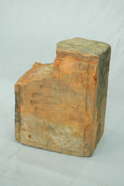 本件大角磚的頂面經處理,四邊壓框,中為凹下掌印,可能為特定建築製作,與館藏號2004.025.0495、2004.025.0497、2004.025.0499、2004.025.0501壓印相同。大角磚,用於傳統漢式建築的地基或壁體,或磚瓦窯的窯壁或窯門。臺灣由清中葉開始本地即有磚瓦窯,此外,為建築廟宇或大宅,常於建築基地附近設置臨時的磚瓦窯燒製該次建築用磚,大角磚先作為燒窯用途,燒製完成後即用於建築地基或牆體。窯場建築及燒窯使用的大角磚,自清代至今皆維持不變。大角磚製作方法與土埆磚相同,因此具有一般土埆磚的外形特徵,即四個側面的切面與底面平整,頂面粗糙不平,但本件頂面經刮平處理。本件已斷裂為兩塊。