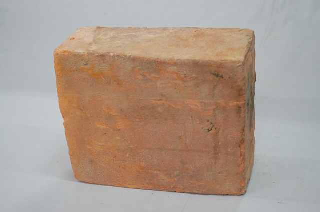 大角磚,用於傳統漢式建築的地基或壁體,或磚瓦窯的窯壁或窯門。臺灣由清中葉開始本地即有磚瓦窯,此外,為建築廟宇或大宅,常於建築基地附近設置臨時的磚瓦窯燒製該次建築用磚,大角磚先作為燒窯用途,燒製完成後即用於建築地基或牆體。窯場建築及燒窯使用的大角磚,自清代至今皆維持不變。大角磚製作方法與土埆磚相同,因此具有一般土埆磚的外形特徵,即四個側面的切面與底面平整,頂面粗糙不平,但本件頂面經刮平處理。本件一面有指印。