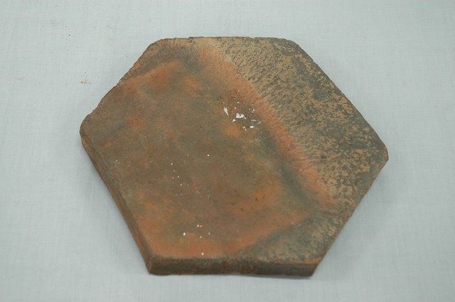 本文物為六角磚,六角磚為地磚,用於傳統漢式閩南式廟宇或民居的鋪面。本件磚的厚度約4公分,比一般六角磚厚度約2公分多了一倍長度。一面呈完全燒製的紅色,一面則只有部分呈紅色,部分為生坯黑灰色,側面則為未燒製前的磚坯黑灰色。由其厚度與顏色,推測本磚為窯場內使用的磚,於窯內堆疊磚坯時用來做為墊片的磚材,因此只有部分完全燒製成紅色,部分仍為生坯顏色。