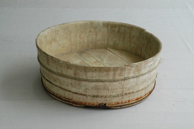 本文物為土桶,又稱拌合桶、泥漿桶,是土水司傅的工具。用來拌合水泥、砂、水,拌合好的糊狀物稱為水泥砂漿,用來抹壁、砌磚、鋪地磚等。本件土桶的桶身及桶底皆以木板製成,外圍三層鐵箍固定,為木桶店所作。最底層的鐵箍已鏽蝕並往下脫落。日本時代的木桶外以竹篾為箍,戰後才以鐵絲代替。木製土桶雖在1960年代以後逐漸被亞鉛、塑膠製品取代,但至今仍有木桶店持續製作。根據購藏來源資料,本件文物來自花蓮。