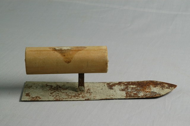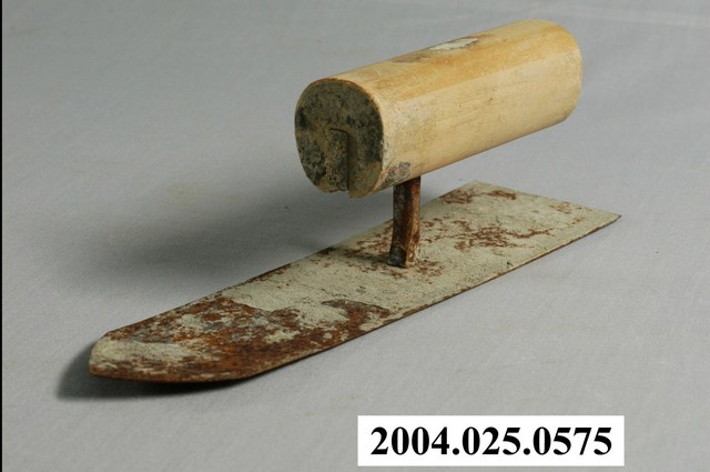 本件文物為小抹刀,土水匠師用來塗敷壁面灰漿作打底層時所用的工具。本件小抹刀長6寸半,刀面長度較基本款抹刀小,用於邊縫及角落,將灰漿均勻推平。