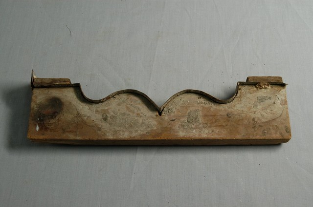 本件文物為拖板線,是土水匠師作天花板或外檐線腳的外模工具,線腳為日本時代以後所傳入的洋式建築作法。視各建物施作的需要製作不同的模子。拖板線以木模切割成線腳的斷面,包括弧線及直線,與灰漿接觸面常包覆鐵片以加強耐用度。施作時以平行拖動方式塑出線腳表面。本件拖板線於金屬片外再加釘木條,應為匠師再加裝用以握持。 舊系統記錄屏東,可能為取得來源地。