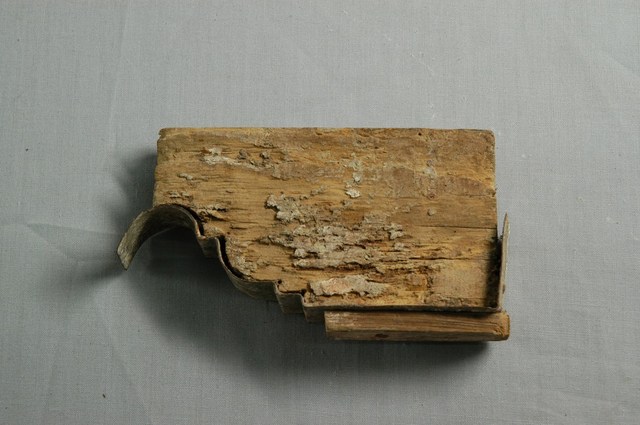 本件文物為拖板線,是土水匠師作天花板或外檐線腳的外模工具,線腳為日本時代以後所傳入的洋式建築作法。視各建物施作的需要製作不同的模子。拖板線以木模切割成線腳的斷面,包括弧線及直線,與灰漿接觸面常包覆鐵片以加強耐用度。施作時以平行拖動方式塑出線腳表面。本件拖板線於金屬片外再加釘一木條,應為匠師再加裝用以握持。 舊系統記錄屏東,可能為取得來源地。