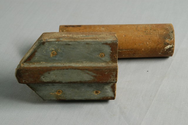 本文物為抹刀,為土水司傅工具。抹刀是由抹刀面、腳、木柄構成。本件抹刀面為木作,下包鐵皮,形狀為中間突起,兩端下凹,用於製作凹槽線腳。根據購藏來源資料,本件文物來自花蓮。