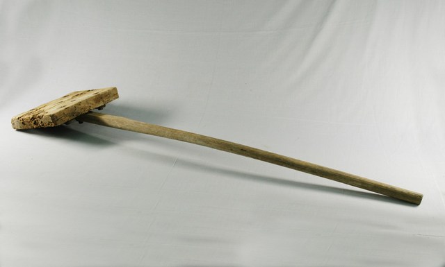 本文物為拖板,為土水司傅的工具。木板底部為平面,後加木柄,用來抹平地面灰漿。通常為土水司傅自行製作。根據購藏來源資料,本件工具來自高雄。