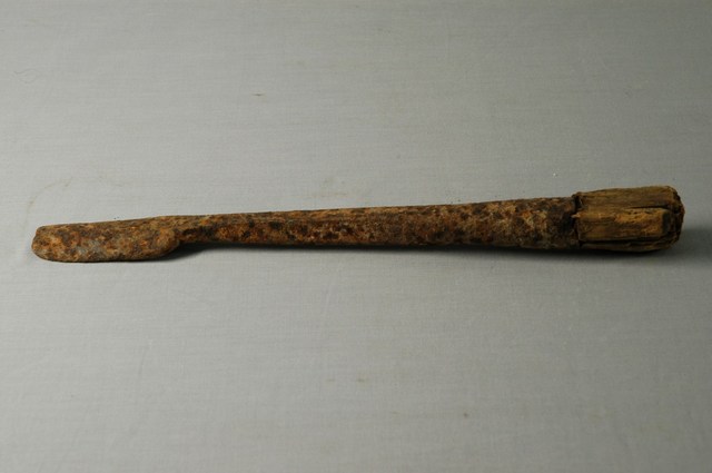 鑿刀為木工工具,為鑿刀,又稱鑿仔。在建築匠師的工別上,大木、鑿花都會用到鑿刀,家具匠師也會使用。通常與鎚配合作業。鑿刀通常由刀片、刀柄、鐵環三種構件組成。若不必搭配鎚的細部作業,則鑿刀不必在刀柄尾端加鐵環。本件木柄已裂開風化,已無法判斷原來是否安裝鐵環。鑿刀依刀口形狀不同,分為圓口與平口兩類,本件為圓口鑿刀,刀身嚴重鏽蝕。鑿刀用以削木、鑿洞、作榫等作業。木作匠師常購買刀刃,再自行製作刀柄製成鑿刀。近期工具店亦販賣成品。