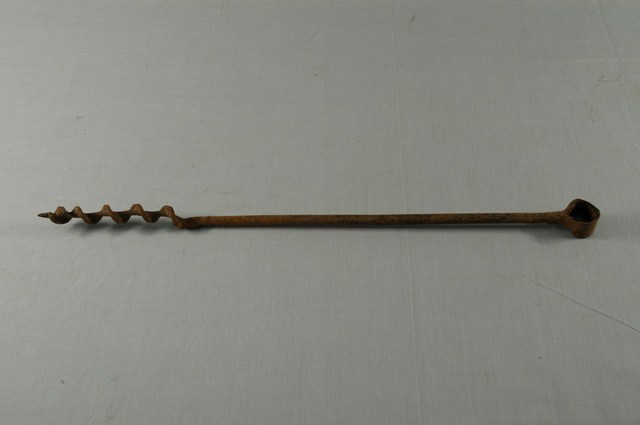 本文物為螺鑽,又寫作累鑽,為日本時代引入的伐木工具,於砍樹作業時使用,用來在樹幹上鑽洞的工具。螺鑽以鐵製鑽和木柄構成,本件不含柄。鑽為圓形鐵條,鑽頭為尖頭螺旋形,利於往前推進,鑽身直徑較鑽頭小,鑽身後端銲接空心圓管套件,作成垂直向圓管以套入木握柄。使用時兩手握握柄兩端轉圈,施力往前進。使用在砍傾斜且直徑大的樹時,為防止樹倒時因重量偏斜造成裂開而損失材積,因此先以累鑽鑽出成排的洞,此動作稱為綁根。再以落頭鋸沿綁根洞形成的線條鋸開。根據購藏來源資料,本件工具來自花蓮。