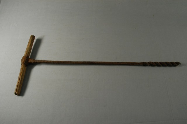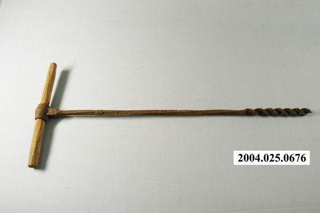 本文物為螺鑽,又寫作累鑽,為日本時代引入的伐木工具,於砍樹作業時使用,用來在樹幹上鑽洞的工具。螺鑽以鐵製鑽和木柄構成。鑽為四角形鐵條,鑽頭為尖頭螺旋形,利於往前推進,鑽身直徑較鑽頭小,鐵條扭轉。鑽身後端焊以垂直向圓管套件,用來套入木握柄。使用時兩手握握柄兩端轉圈,施力往前進。使用在砍傾斜且直徑大的樹時,為防止樹倒時因重量偏斜造成裂開而損失材積,因此先以累鑽鑽出成排的洞,此動作稱為綁根。再以落頭鋸沿綁根洞形成的線條鋸開。根據購藏來源資料,本件工具來自花蓮。