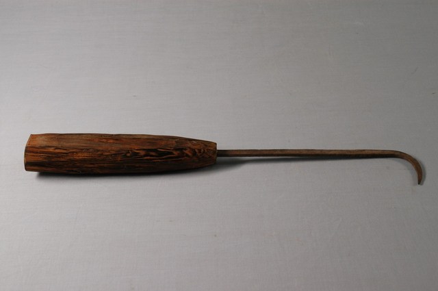 本文物為手鉤,為搬運工勾住貨物移動的工具。日本時代由日本引入。手鉤為鐵製鉤頭,鉤身長,鉤身後端鐵棒插入木柄內。有長柄、短柄兩類,適用於不同物品的勾取,本件為短柄,削成角形,為戰後初期以後作法。鉤細薄,適用於搬運較輕的貨品,以手鉤勾住拖移。手鉤最早引入時多用於糖業、船舶等日資或官方事業,後普及為農漁業搬運使用,可用於勾取農魚貨等,用途廣泛。根據購藏來源資料,本件工具來自屏東。
