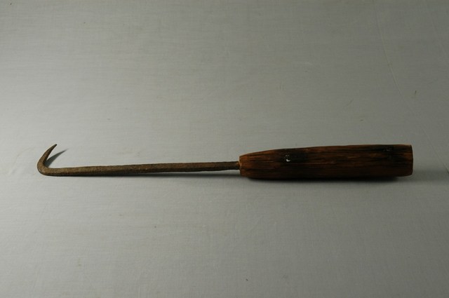 本文物為手鉤,為搬運工勾住貨物移動的工具。日本時代由日本引入。手鉤為鐵製鉤頭,鉤身長,鉤身後端鐵棒插入木柄內。有長柄、短柄兩類,適用於不同物品的勾取,本件為短柄,削成角形,為戰後初期以後作法。鉤細薄,適用於搬運較輕的貨品,以手鉤勾住拖移。手鉤最早引入時多用於糖業、船舶等日資或官方事業,後普及為農漁業搬運使用,可用於勾取農魚貨等,用途廣泛。根據購藏來源資料,本件工具來自屏東。