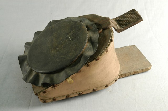 1.本物件為雙面木製面板,中間以皮囊製成的風箱,一側有出風口,上方安裝有踩踏用金屬板,又稱「腳踏式鼓風爐」。