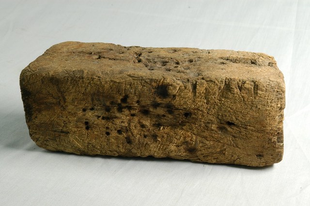 1.本物件是一個早期打金鍛造使用的實木鉆座,外觀呈長方體,表面有大小不一的坑洞、切痕。金屬工藝的「打形」基本技法,是使用槌子在木鉆座上敲平或錘薄金屬,完成所需要的首飾造型。