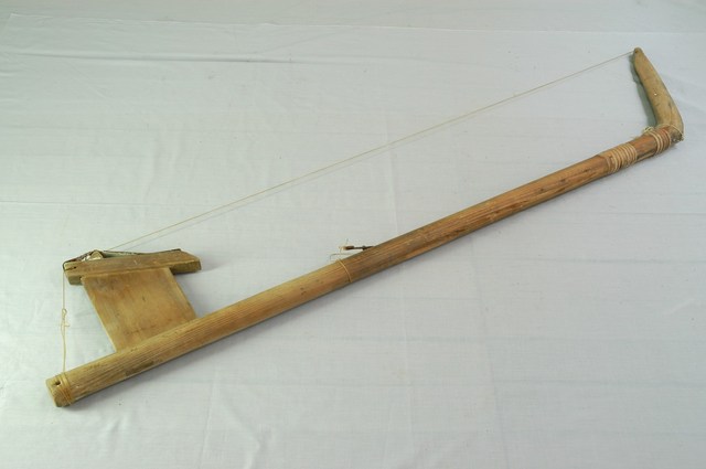 1.本物件為手工打棉被工具之一,外型如一把彎弓,弓線多採用牛筋繩,彈弓主要用以彈開棉絮,使棉被鬆軟而保暖。