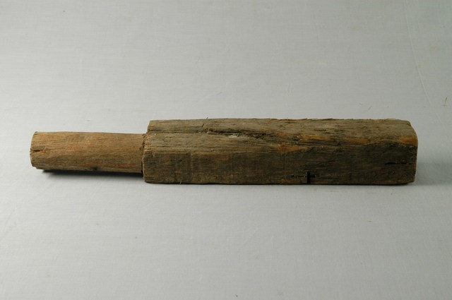 1.本物件為木製槌草用具,握柄略短為圓柱形,槌草處為長方體。 2.藺草乾燥後不夠柔軟,故將一小束藺草噴上些水後綁緊,用木槌槌打草莖變得柔軟,並成為扁平狀,以利編織,且手指較不易受傷。