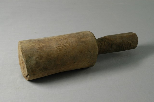 1.本物件為木製打草槌,握柄為長條狀木塊,草槌為大圓柱形木塊。 2.藺草乾燥後不夠柔軟,故將一小束藺草噴上些水後綁緊,用木槌槌打草莖變得柔軟,並成為扁平狀,以利編織,且手指較不易受傷。