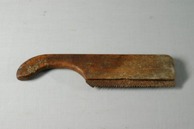 本文物為鋸草手鋸,以鋸片和木握把構成。是做草編、竹籐編時用來鋸草、藤條、竹篾的工具。根據購藏來源資料,本件工具來自南投。