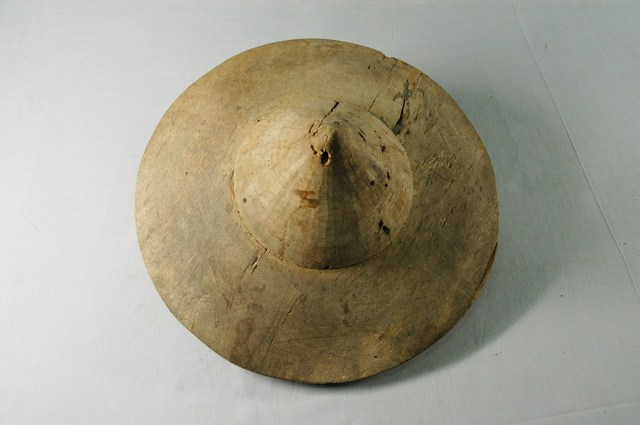 1.本物件為木製斗笠模型,包含圓錐狀帽頂、圓盤形帽簷兩部分組成。斗笠模主要是作斗笠的笠胎或骨架之用,使骨架在木模上編成,大小都一樣。斗笠製作者先用手將竹篾(竹子剖成的長條薄片)編成笠頭後,再將笠頭套在斗笠模上,在斗笠模上編成笠胎。笠胎完成後,便進行「吸笠」的步驟,也就是將桂竹葉一片片覆蓋在笠胎上,覆蓋完後用線將葉片牢牢縫合,稱為「牽笠線」,牽完笠線,一頂遮風擋雨的斗笠便完成了。