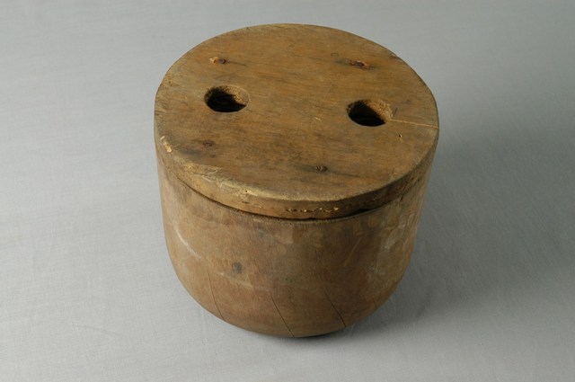 1.本物件為木製圓柱形草帽模,底部有2個圓形孔洞,又稱「帽仔模」,用於編織草帽頭型。草帽模是要編草帽時有1個帽模,編帽人在帽模上來編,如此帽子大小都有一定的形狀,雖是手工,但定型可量產。