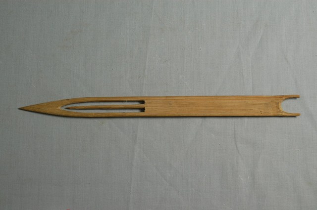 本物件為竹製漁網結網器,結網器為梭狀,除結網外亦作為修補漁網之用途,其材質有竹、木、鐵、銅、塑料,竹製為較常見,可略分為大號(約20-50cm,用來封漁網及修補粗線網)、小號(10cm以下,主要用來修補漁網)及介於其中的中號,中號由於大小適中,主要用來織各種漁網,結網器為織漁網的重要工具。