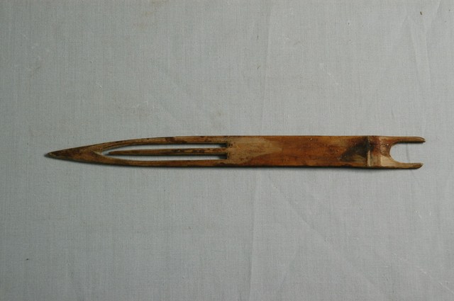 本物件為竹製漁網結網器,結網器為梭狀,除結網外亦作為修補漁網之用途,其材質有竹、木、鐵、銅、塑料,竹製為較常見,可略分為大號(約20-50cm,用來封漁網及修補粗線網)、小號(10cm以下,主要用來修補漁網)及介於其中的中號,中號由於大小適中,主要用來織各種漁網,結網器為織漁網的重要工具。