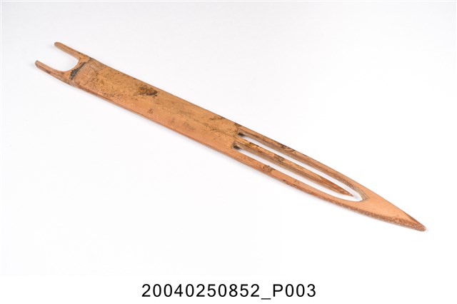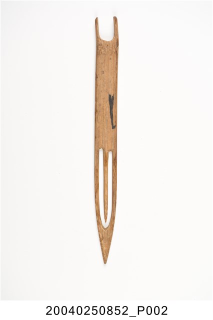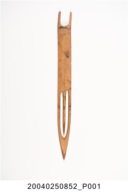 本物件為竹製漁網結網器,結網器為梭狀,除結網外亦作為修補漁網之用途,其材質有竹、木、鐵、銅、塑料,竹製為較常見,可略分為大號(約20-50cm,用來封漁網及修補粗線網)、小號(10cm以下,主要用來修補漁網)及介於其中的中號,中號由於大小適中,主要用來織各種漁網,結網器為織漁網的重要工具。