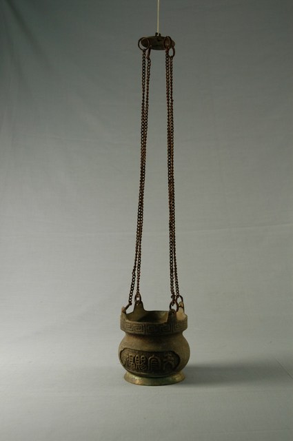 本件為銅質天公爐,爐體圓形有四耳,四耳銜四條鏈條,鏈條最上方再接一個圓型爐蓋,懸掛於燈樑之上,器腹有「天官賜福」字樣。此件地點為客家屏東。常見民間家宅神明廳之燈樑上懸掛一個天公爐,早晚燒香奉拜時,以天公為第一個敬拜之對象。一般天公爐旁會搭配天公燈。
