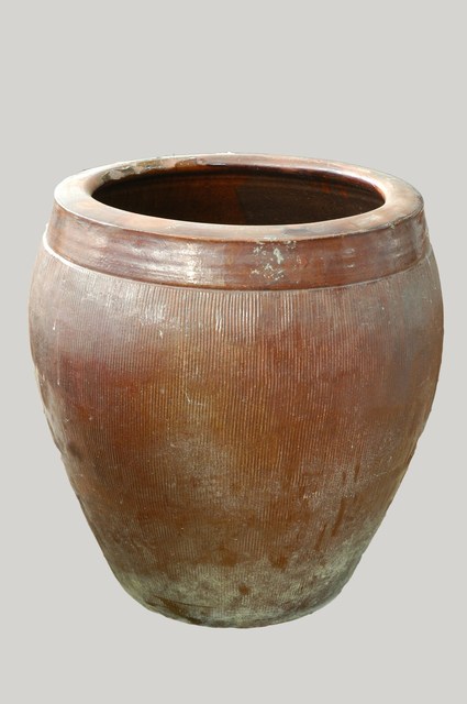 紅褐釉壓印直紋水缸,廣口,圓弧腹,器身最寬處為於腹部偏上方,向下逐漸內收至底部,平底。全器施紅褐釉,外器壁緣口處壓印一圈凹痕,凹痕以下壓印細密直紋,肩部上方近口部印有一方框,其中為「OKA」和「興成」字樣,底部可能因使用磨損而出現大面積灰白色塊。本件形制較小,為中型的水缸,亦可作米缸使用。其器型勻稱,紋路精細,推測為近代作品。