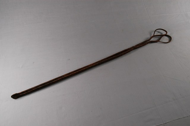 本文物為火鉗,又稱鐵鉗、火夾,為打鐵店從火爐內夾取高溫鐵件,或家庭廚房由燒炭爐灶內夾取燃燒炭的工具。火鉗以二支鐵條交叉,疊合處以螺絲固定。本件火鉗鉗頭為直條,前端壓扁為片狀,利於夾住片狀物。螺絲後端彎折為圈形柄。火鉗長度較長,便於深入高溫爐中夾取及避免拿取時遭高溫鐵件或木炭燙傷。根據典藏來源資料,本件文物收集來源地在花蓮。