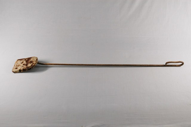本文物為火鏟,又稱灰燼鏟,為打鐵店火爐或廚房燒炭磚灶扒除灰燼的工具。本件火鏟為鐵製,鏟面為寬平面,兩側向上彎折以利裝盛,平口,適用於平底爐灶。鏟柄尾端做成圈形以握持及掛放收納。本件火鏟與西方清理灶爐灰燼採鏟形式相同。根據典藏來源資料,本件文物收集來源地在花蓮。