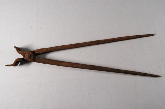 本文物為鐵鉗,為打鐵店用來夾取高溫軟化鐵件的工具,又稱打鐵鉗、鐵鉗、鍛造鉗、火夾。長度較長,便於深入高溫爐中夾取及避免拿取時遭高溫鐵件燙傷。鐵鉗以二支鐵條交叉,疊合處以螺絲固定。本件鐵鉗鉗頭短,鉗柄長,鉗頭前端彎折成U字型,呈扁平面,利於夾取棒狀或厚度較大鐵片,為平嘴鉗。一邊鉗頭斷裂不存。螺絲後端為直柄,以手掌握合施力壓合鉗頭。根據典藏來源資料,本件文物收集來源地在花蓮。