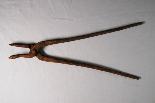 本文物為鐵鉗,為打鐵店用來夾取高溫軟化鐵件的工具,又稱打鐵鉗、火鉗、鍛造鉗、火夾。長度較長,便於深入高溫爐中夾取及避免拿取時遭高溫鐵件燙傷。鐵鉗以二支鐵條交叉,疊合處以螺絲固定。本件鐵鉗鉗頭短,鉗柄長,鉗頭呈扁平面,利於夾取鐵件,為平嘴鉗。螺絲後端為直柄,以手掌握合施力壓合鉗頭。根據典藏來源資料,本件文物收集來源地在花蓮。
