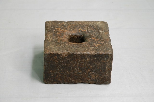 本文物為鐵砧,打鐵工具。為方形鐵塊,一面中凹方孔。凹孔用以放置模具下部的錐,鐵匠將高溫軟化鐵片置於模具上捶打塑形。根據典藏來源資料,本件文物收集來源地在臺東。