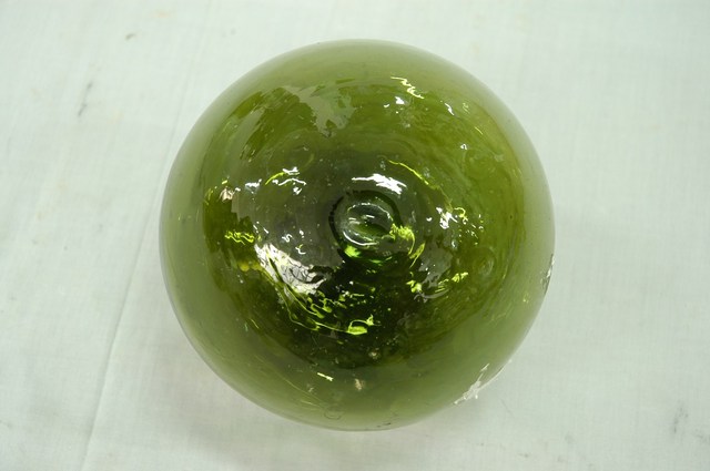 1.本物件為浮標,為空心玻璃球,利用空心原理讓球落到水中可以浮在水面上,以利捕魚工作。 2.用途:是50年代前討海人,從事捕撈作業時綁在漁網上的浮標,利用浮球會浮在水上的特性,將浮球沿著繩子垂釣,放在水上作為抓魚的記號。
