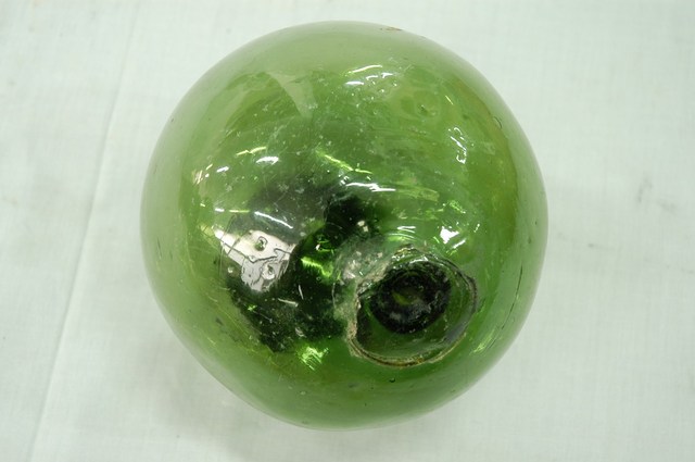 1.本物件為浮標,為空心玻璃球,利用空心原理讓球落到水中可以浮在水面上,以利捕魚工作。 2.用途:是50年代前討海人,從事捕撈作業時綁在漁網上的浮標,利用浮球會浮在水上的特性,將浮球沿著繩子垂釣,放在水上作為抓魚的記號。
