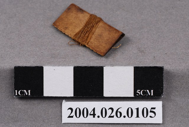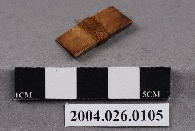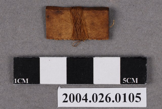 本物件為棕色縫合線。棕色縫合線被纏繞整理在一扁平長方型物體上。