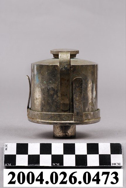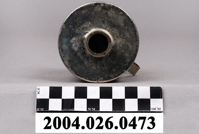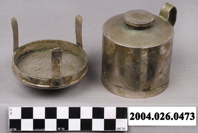 本物件為診療用酒精燈。診療用酒精燈為金屬製品,可以分成兩部分,酒精燈與架子。酒精燈有握把。
