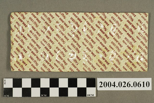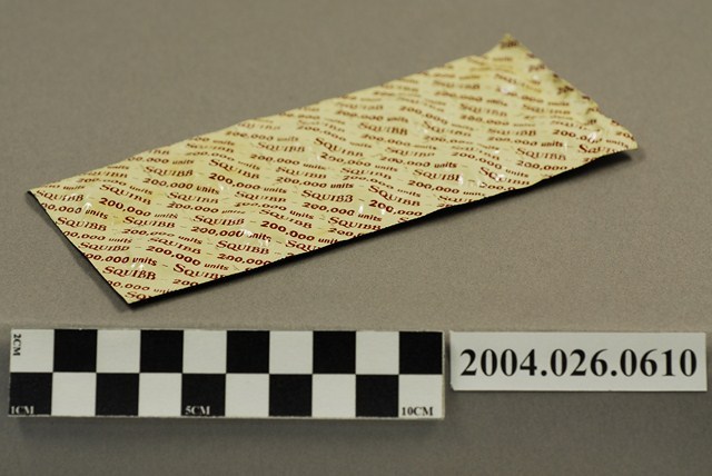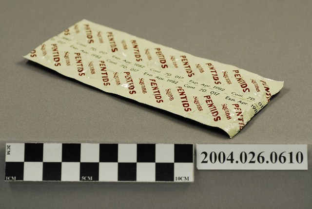 本物件為PENTIDS SQUIBB藥排。此藥排有10顆藥。包裝為不透明,無法視見藥品,有切割線。藥排包裝一面上印有PENTIDS、SQUIBB、Cont. 7D. 017、Exp. Apr. 1982字樣,另一面印有SQUIBB、200,000 units字樣。