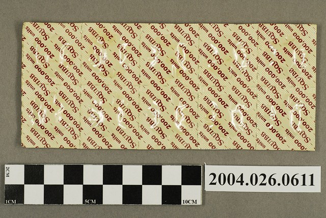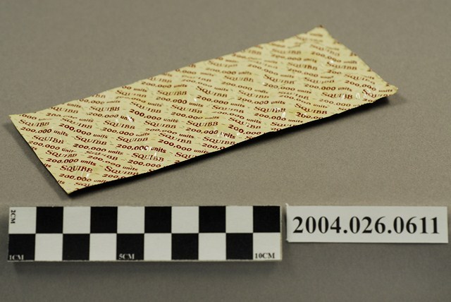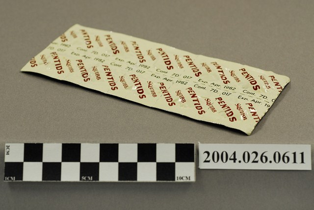 本物件為PENTIDS SQUIBB藥排。此藥排有10顆藥。包裝為不透明,無法視見藥品,有切割線。藥排包裝一面上印有PENTIDS、SQUIBB、Cont. 7D. 017、Exp. Apr. 1982字樣,另一面印有SQUIBB、200,000 units字樣。