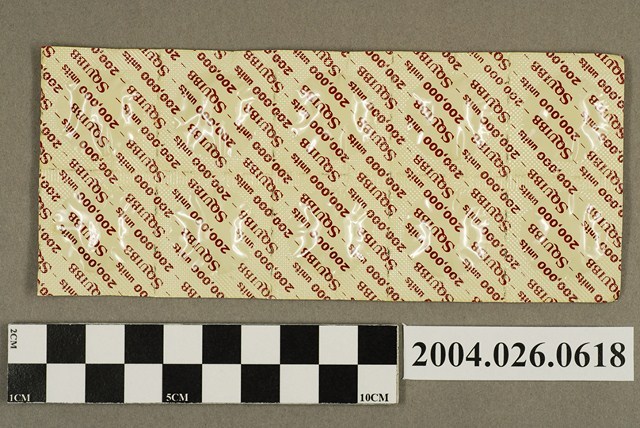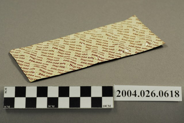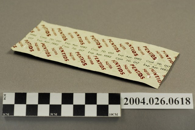 本物件為PENTIDS SQUIBB藥排。此藥排有10顆藥。包裝為不透明,無法視見藥品,有切割線。藥排包裝一面上印有PENTIDS、SQUIBB、Cont. 7D. 017、Exp. Apr. 1982字樣,另一面印有SQUIBB、200,000 units字樣。