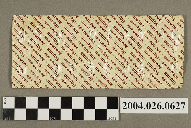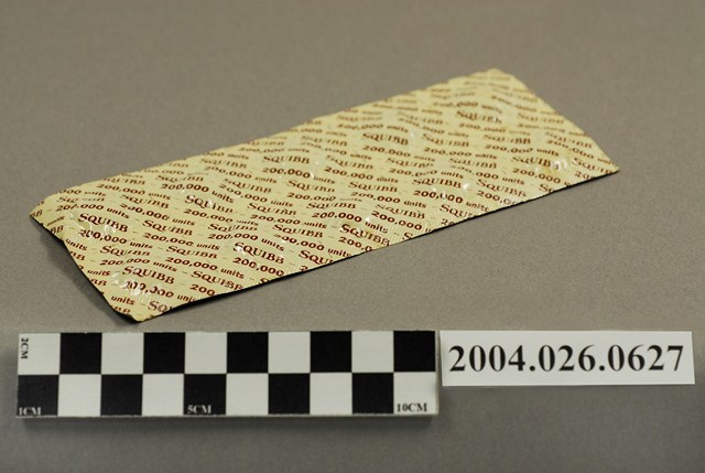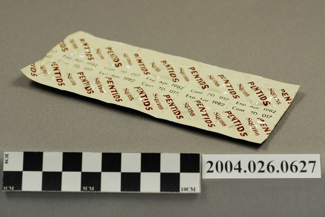 本物件為PENTIDS SQUIBB藥排。此藥排有10顆藥。包裝為不透明,無法視見藥品,有切割線。藥排包裝一面上印有PENTIDS、SQUIBB、Cont. 7D. 017、Exp. Apr. 1982字樣,另一面印有SQUIBB、200,000 units字樣。