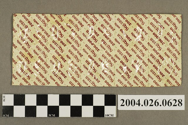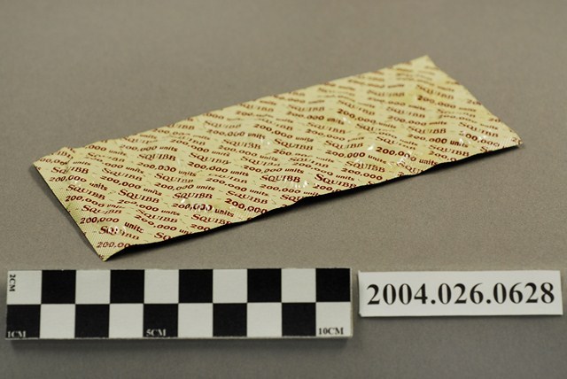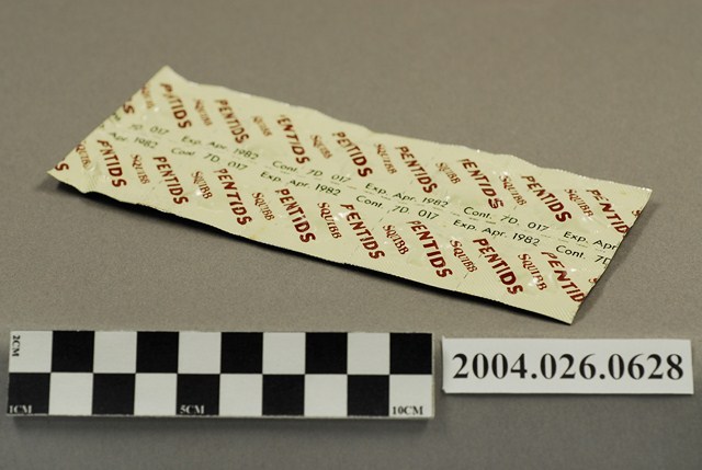 本物件為PENTIDS SQUIBB藥排。此藥排有10顆藥。包裝為不透明,無法視見藥品,有切割線。藥排包裝一面上印有PENTIDS、SQUIBB、Cont. 7D. 017、Exp. Apr. 1982字樣,另一面印有SQUIBB、200,000 units字樣。