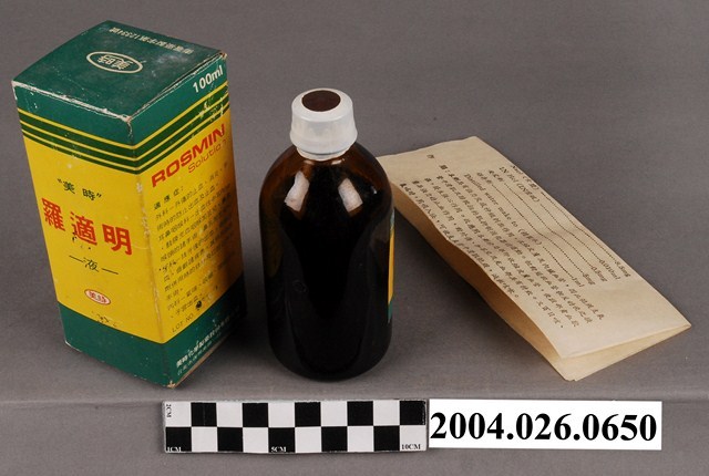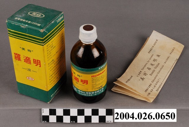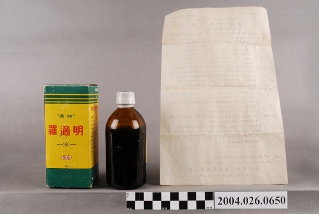 1. 本物件為美時化學製藥股份有限公司出品羅適明液。共有3個物品,分別為包裝紙盒、藥瓶和說明書。