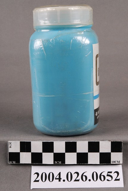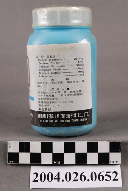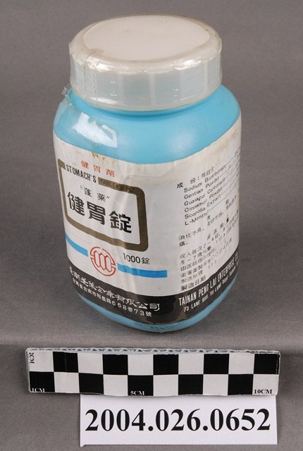 1. 本物件為臺南蓬萊企業有限公司出品健胃錠。包裝為藍色不透明塑膠瓶,白色半透明塑膠蓋。瓶身封膜有破損。瓶身貼有標籤,標籤上印有健胃劑、蓬萊健胃錠、1000錠、衛署藥製字第00846號等字樣,以及成分、效能、用法用量、製藥廠等資訊,效能有消化不良、食慾不振、胃酸過多、胃痛。