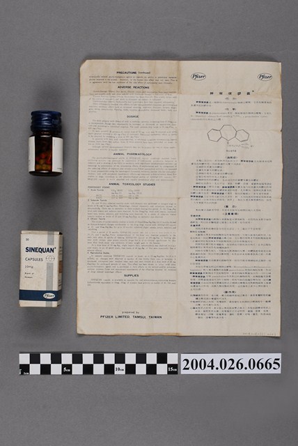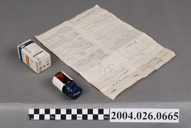 2.根據衛生福利部食品藥物管理署藥物許可證登記所示,此藥適應症:焦慮狀態、憂鬱病。輝瑞(Pfizer Inc.)於1849年在美國紐約成立,於1962年在臺灣設立分公司,臺灣輝瑞大藥廠成為國內第一家申請獲准的外商藥廠,臺灣總公司設於淡水。經查此藥之許可字號有效期限為西元1970-1998年,故此藥物為此時期產物。