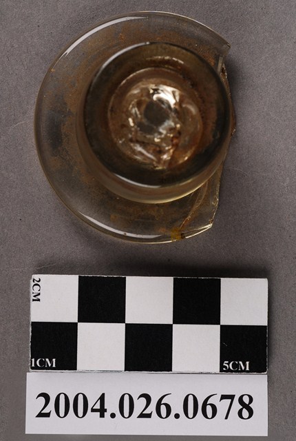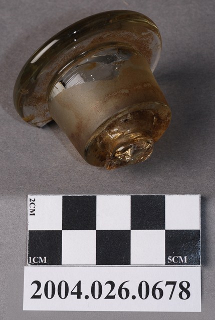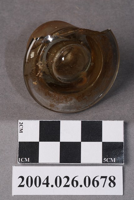 本物件為玻璃蓋,廣口瓶蓋,無色透明玻璃材質。蓋頂有破損與變色,蓋身有變色。
